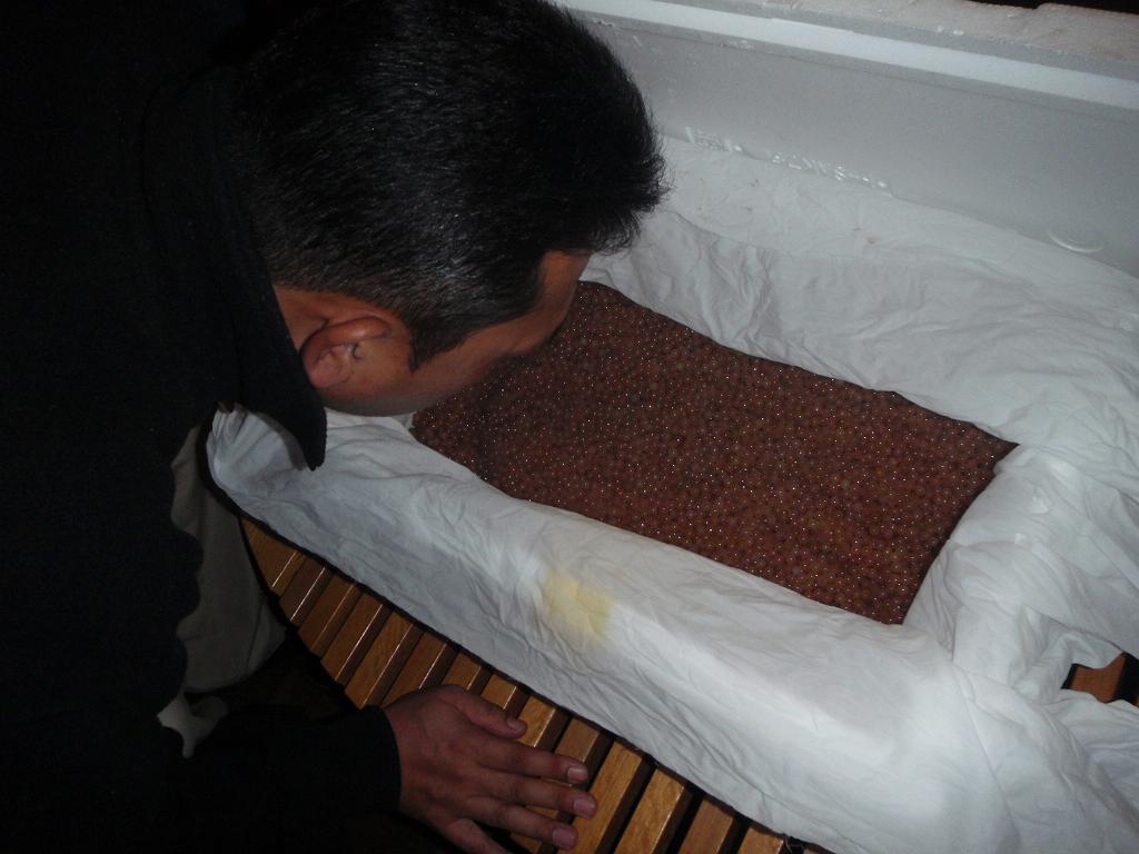 シンポジウムも無事終り、翌日放卵するサクラマスの卵を見てみました。